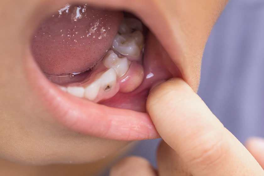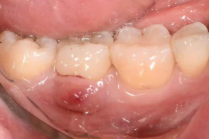- Presenza di una “bolla” o rigonfiamento biancastro sulla gengiva