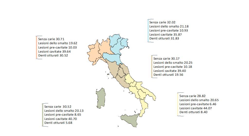 In Italia, la situazione varia a seconda delle fasce e delle aree geografiche. Tra i bambini di 12 anni, circa il 43,1 % presenta carie. dati sulla fascia 6–9 anni in Abruzzo mostrano una prevalenza crescente dal 39,5 % a 6 anni fino al 60,8 % a 9 anni, con percentuali più elevate nelle zone rurali rispetto a quelle urbane. Tra i 12enni, solo circa il 30 % risulta senza carie, mentre il restante 70 % presenta lesioni di diversa gravità, con maggiore incidenza nel Sud Italia . Le statistiche provengono da studi epidemiologici nazionali (National Pathfinder) e da ricerche regionali certificate secondo criteri dell’Organizzazione Mondiale della Sanità, fornendo dati affidabili nel contesto della deontologia odontoiatrica e della trasparenza sanitaria.