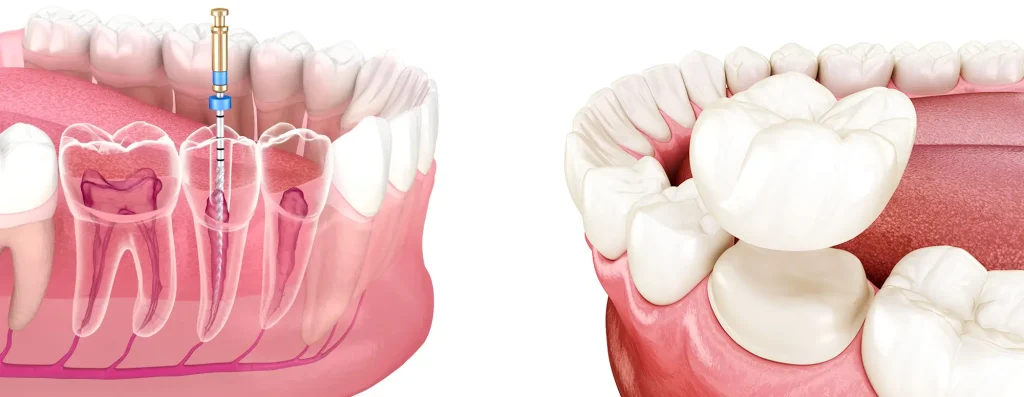 Ricostruzione del dente, talvolta con una corona per rinforzarlo.