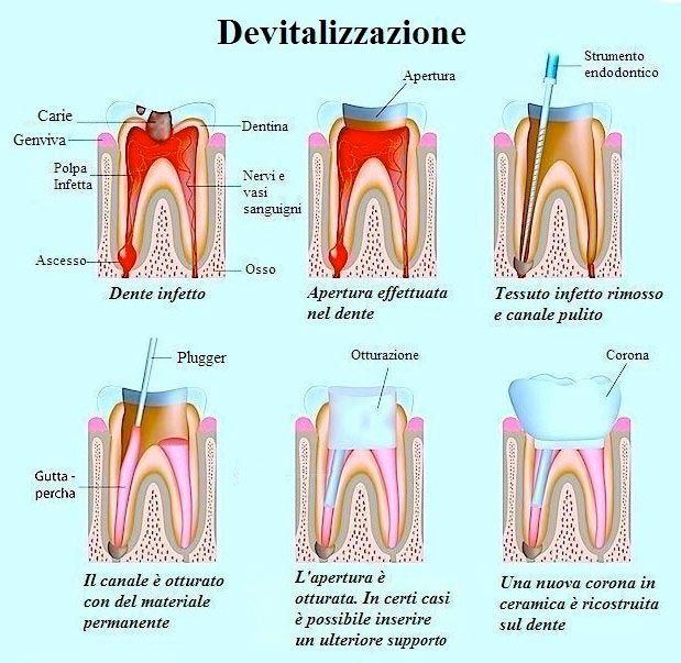 La devitalizzazione consiste nella rimozione della polpa dentale, cioè il tessuto molle all’interno del dente che contiene nervi e vasi sanguigni. Quando questa parte si infiamma o si infetta, non è più possibile recuperarla: la soluzione è eliminarla, disinfettare i canali radicolari e sigillarli per impedire nuove infezioni.