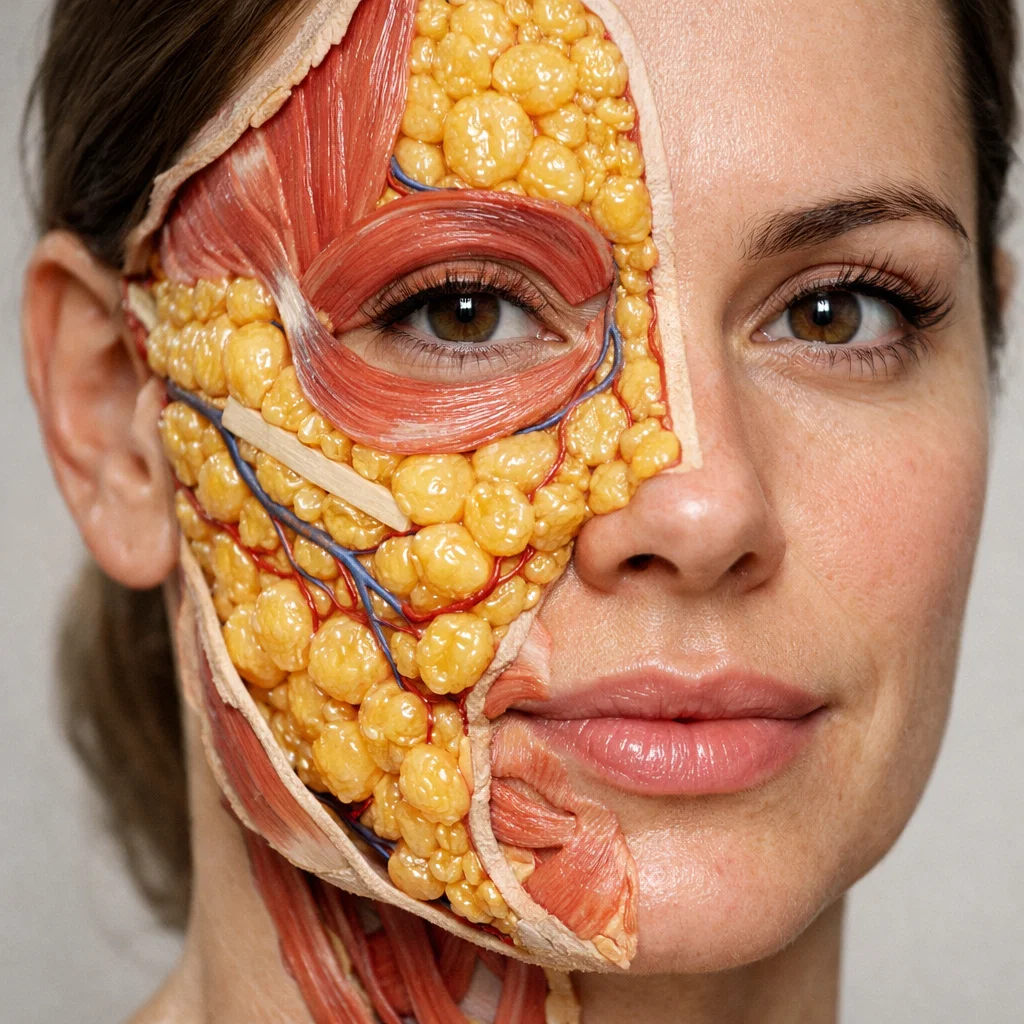 Sopra l’osso si trova il tessuto adiposo sottocutaneo, cioè il grasso del viso. Questo strato non è uniforme, ma organizzato in compartimenti che sostengono e modellano i volumi facciali. La quantità e la distribuzione del grasso influenzano direttamente la profondità del solco. Un maggiore volume nella regione degli zigomi può creare un contrasto più marcato con l’area del labbro superiore.
