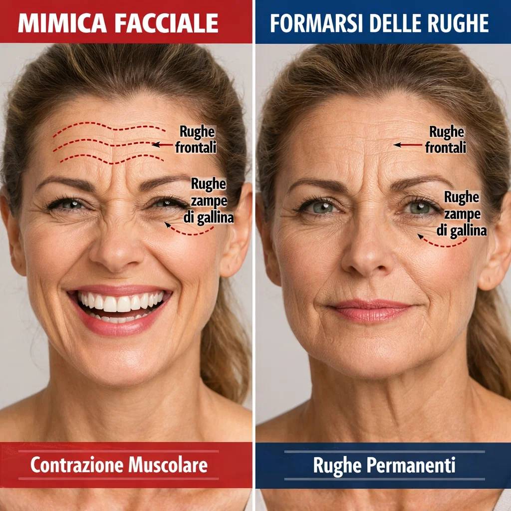 Con l’età si verificano cambiamenti fisiologici che interessano tutti i livelli del volto. La pelle perde progressivamente collagene, la proteina che garantisce compattezza e resistenza. Anche le fibre elastiche si riducono, rendendo la cute meno tonica. Quando la pelle diventa meno elastica, le pieghe già presenti tendono ad accentuarsi.