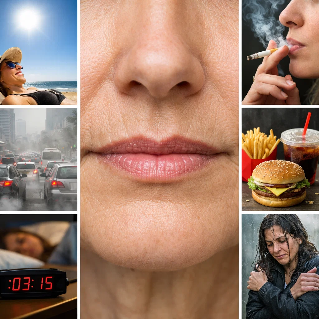 Oltre ai fattori anatomici e fisiologici, esistono elementi esterni che possono accentuare la profondità delle pieghe del volto. L’esposizione cronica al sole danneggia collagene ed elastina attraverso il cosiddetto fotoinvecchiamento, accelerando la perdita di elasticità cutanea. Il fumo compromette la microcircolazione e riduce l’ossigenazione dei tessuti, favorendo un invecchiamento precoce della pelle.